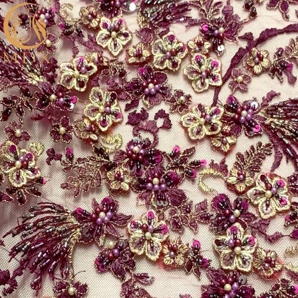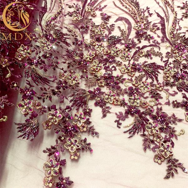 Purple 3D Embroidery Lace Fabric 0.9144 Meter For Nigerian Wedding Dress Images |