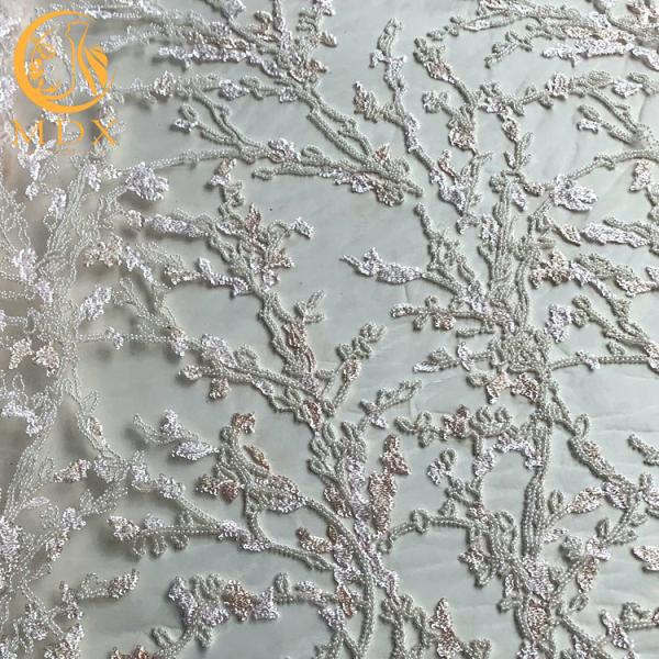 Machine Embroidery Beaded White Lace Fabric MDX Sequin 20% Polyester Images |